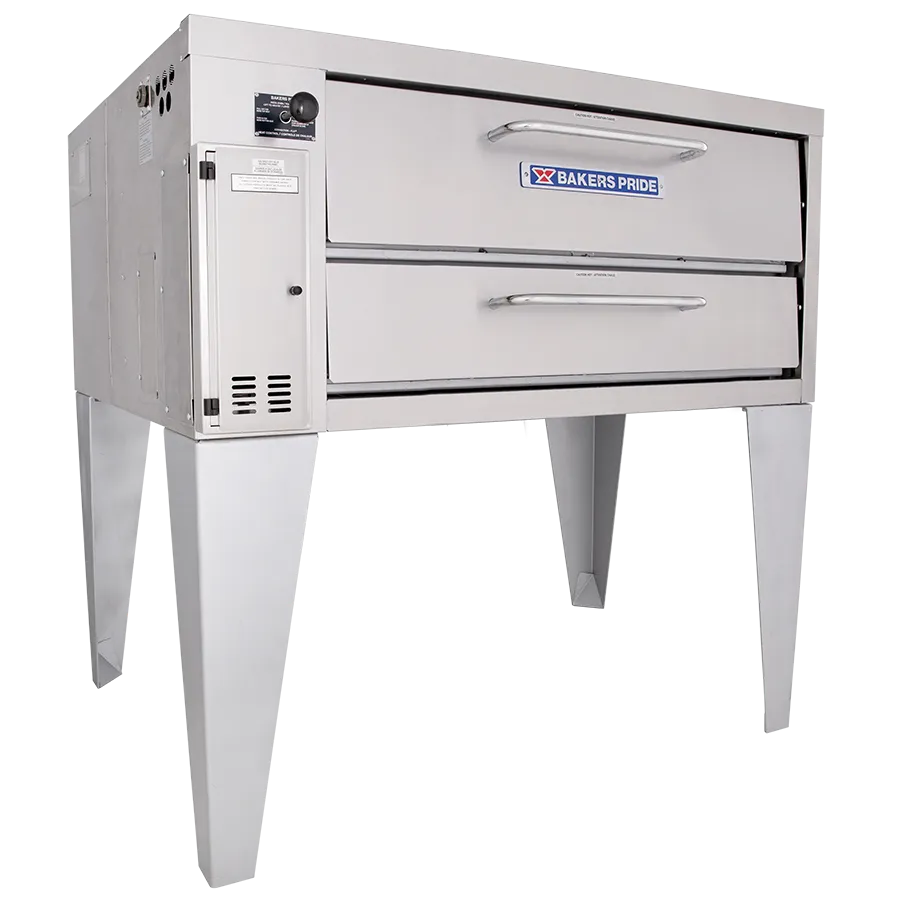 The Bakers PrideĀ® model 351 standard-depth gas pizza oven is designed for all your high-volume baking needs. The single oven chamber features a Cordierite deck with 8" deck height and independently controlled top and bottom heat dampers for perfectly balanced results. This 57" wide model is constructed with heavy-duty angle iron frame, which is fully welded to allow for stacking up to three ovens. The oven exterior is heavy-duty stainless steel and fully insulated for cooler outer temperatures and consistent interior temperatures.