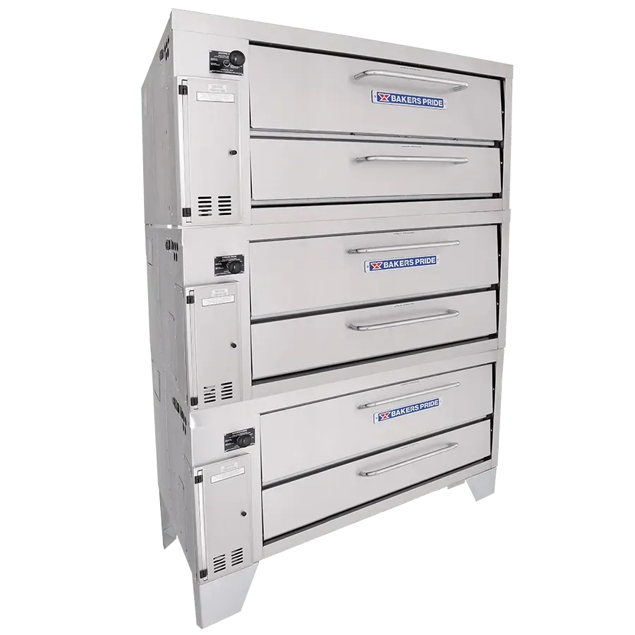 The Bakers PrideĀ® model 353 standard-depth triple-stacked gas pizza oven is designed for all your high-volume baking needs. This triple-stacked oven features three Cordierite decks with 8" deck heights and independently controlled top and bottom heat dampers for perfectly balanced results. This 57" wide model is constructed with heavy-duty angle iron frame, which is fully welded to allow for stacking. The oven exterior is heavy-duty stainless steel and fully insulated for cooler outer temperatures and consistent interior temperatures.