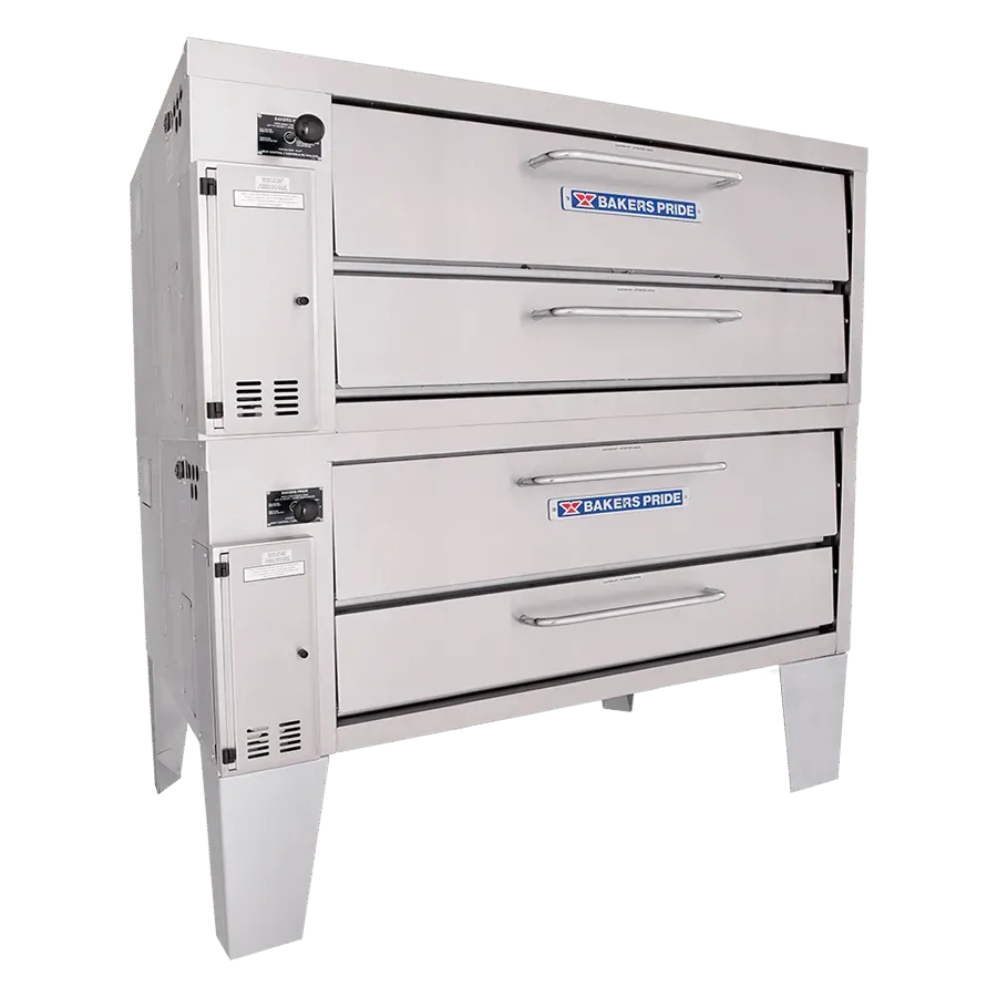 Ideal for kitchens with narrow aisles, the Bakers PrideĀ® model 4152 double-stacked gas pizza oven is designed with a shallow depth to save space while accommodating the high-volume needs of traditional cook lines. This double-stacked oven features two Cordierite decks with 8" deck heights and independently controlled top and bottom heat dampers for perfectly balanced results. This 66" wide model is constructed with heavy-duty angle iron frame, which is fully welded to allow for stacking. The oven exterior is heavy-duty stainless steel and fully insulated for cooler outer temperatures and consistent interior temperatures.