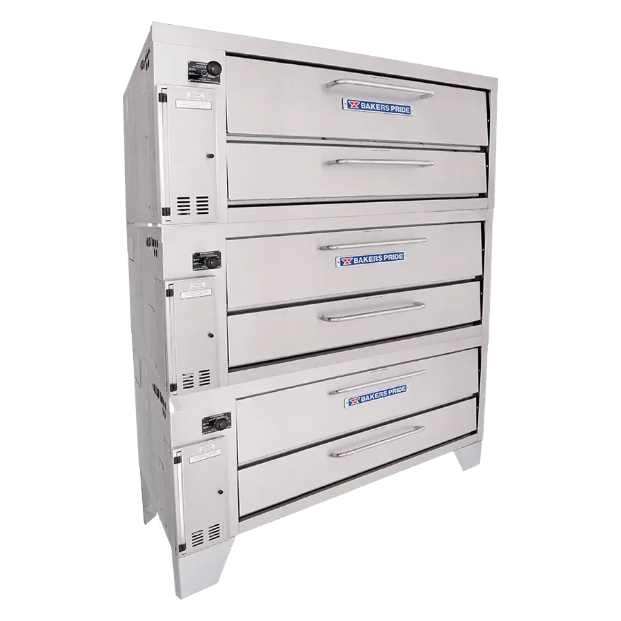 The Bakers PrideĀ® model 453 standard-depth triple-stacked gas pizza oven is designed for all your high-volume baking needs. This triple-stacked oven features three Cordierite decks with 8" deck heights and independently controlled top and bottom heat dampers for perfectly balanced results. This 66" wide model is constructed with heavy-duty angle iron frame, which is fully welded to allow for stacking. The oven exterior is heavy-duty stainless steel and fully insulated for cooler outer temperatures and consistent interior temperatures.