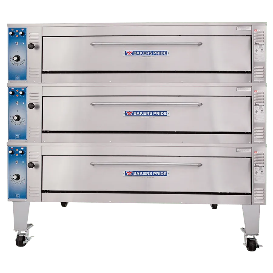 The Bakers Pride® model EB-3-8-5736 pizza oven is ideal for high-volume restaurants, offering the same durability and performance as our gas deck ovens with the low maintenance of an electrical system. This triple-stacked model has three steel decks with 8” deck heights. The independently controlled, U-shaped heating elements on top and bottom allow for uniform temperatures and perfectly balanced baking. This model is constructed with heavy-duty, .25" angle iron frame, which is fully welded to allow for stacking.