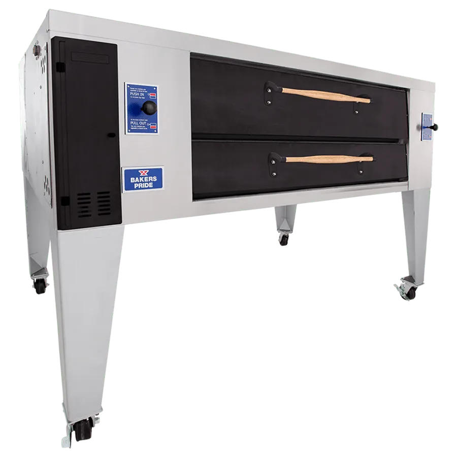 The Bakers PrideĀ® model Y-600-DSP extra-wide gas pizza oven is perfect for display cooking and exhibition kitchens. This model is designed to be built in behind a decorative facade of brick, stone, or tile. Optional front and side skirts allow tile or stone to be easily installed around the legs, while an optional dome top accent finishes off the old-world look. You also have the choice to simply display the oven in stainless steel or finish with black-powder-coated control panels and doors with hardwood handles for an elegant presentation. This model is constructed with heavy-duty, .25" angle iron frame, which is fully welded to allow for double-stacking. The oven chamber features a Lightstone fibrament deck with 8" deck height and independently controlled top and bottom heat dampers for perfectly balanced results. Options are available to suit the configuration of your kitchen, such as side-mounted controls or automatic oven starter.